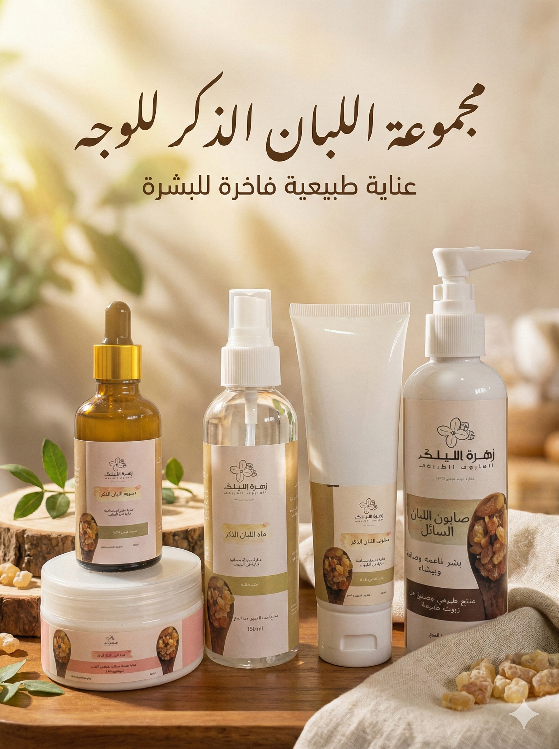 - سيروم اللبان الذكر (50 مل): تركيبة مركزة غنية ومغذية تساعد على ترطيب البشرة بعمق، وتقليل ظهور الخطوط الدقيقة، وتوحيد لون البشرة.